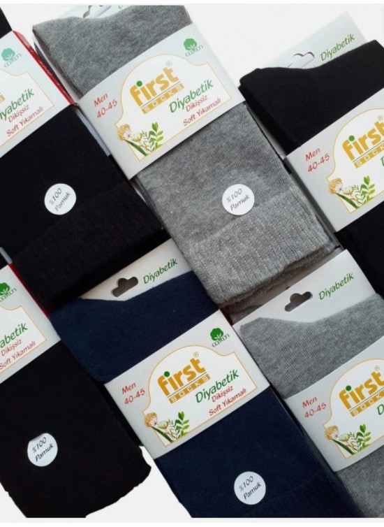First markasının diyabetik erkek çorapları, ayak sağlığınızı korumak ve gün boyu rahatlık sağlamak için özel olarak tasarlanmıştır. Özellikle diyabet hastalarının ihtiyaçları düşünülerek üretilen bu çoraplar, kan dolaşımını engellemeyen yapısıyla öne çıkar.